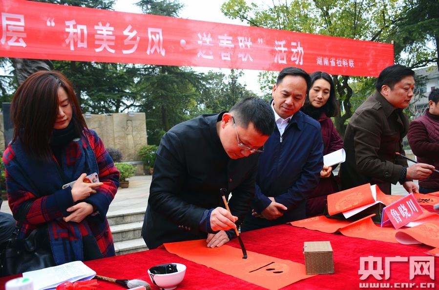 湖南省社科聯(lián)的書(shū)法家們現(xiàn)場(chǎng)潑墨,為群眾免費(fèi)贈(zèng)送春聯(lián)(央廣網(wǎng)發(fā) 劉法蘭攝) 央廣網(wǎng)懷化1月22日消息(記者堯遙 通訊員劉法蘭)雖說(shuō)距離春節(jié)還有二十多天,可是年味已經(jīng)“冒”出了頭。近日,來(lái)自湖南省社科聯(lián)的書(shū)法家們?cè)趹鸦袖悠挚h警予廣場(chǎng)現(xiàn)場(chǎng)揮毫潑墨,為群眾免費(fèi)贈(zèng)送上春聯(lián)和祝福。 此次書(shū)寫(xiě)的春聯(lián)內(nèi)容,都是書(shū)法家首創(chuàng),每一副春聯(lián)就是一副書(shū)法作品,別具新意!拔覀兗沂亲錾獾,希望來(lái)年生意興!”來(lái)自溆浦民主街的舒阿姨請(qǐng)中國(guó)楹聯(lián)學(xué)會(huì)理事、湖南省楹聯(lián)家學(xué)會(huì)副主席魯曉川幫她寫(xiě)一副春聯(lián)。 湖南省社科聯(lián)軟科學(xué)研究室、省社科普及助理研究員龍艷說(shuō),現(xiàn)在大家都習(xí)慣了上街購(gòu)買(mǎi)春聯(lián),忽視了寫(xiě)春聯(lián)的意義和樂(lè)趣!拔覀儼褍(yōu)秀文化送到群眾身邊,也送上最美好的祝愿。通過(guò)進(jìn)基層送春聯(lián)的方式,讓群眾現(xiàn)場(chǎng)體會(huì)到書(shū)法的魅力,感受名家風(fēng)采,喚醒群眾對(duì)傳統(tǒng)文化的記憶! 據(jù)介紹,今年的送春聯(lián)活動(dòng)溆浦是第一站,接下來(lái)他們還將去到省級(jí)貧困村威虎山村,把春聯(lián)送到最基層。此外,湖南省社科聯(lián)每年都會(huì)舉行一系列的社科普及進(jìn)基層活動(dòng),在特定的時(shí)間節(jié)點(diǎn),開(kāi)展不同的文化活動(dòng),加強(qiáng)傳統(tǒng)文化的宣傳,提升文化自信。