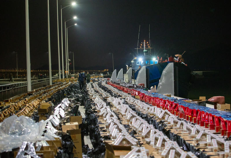 當(dāng)天,廣東深圳海警局接線報稱,在深圳擔(dān)杠頭附近海域有疑似走私活動,當(dāng)局隨即派出南山工作站執(zhí)法艇前往查緝。14時許,海警執(zhí)法艇在該海域發(fā)現(xiàn)一艘無舷號鐵殼船,形跡可疑,海警執(zhí)法員隨即靠近喊話并逼停嫌疑船。經(jīng)登臨檢查發(fā)現(xiàn),船上裝載有大批香煙,船上人員均無法提供相關(guān)合法單證,海警執(zhí)法員遂將涉案人員及船舶等帶回做進一步處理。經(jīng)查,船上共裝有國內(nèi)外知名品牌香煙,共計20萬余條,目前,案件正在進一步偵辦中。