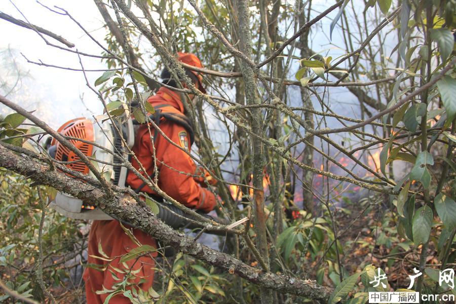 穿行在荊棘密布的陡坡上滅火(張申民 攝)