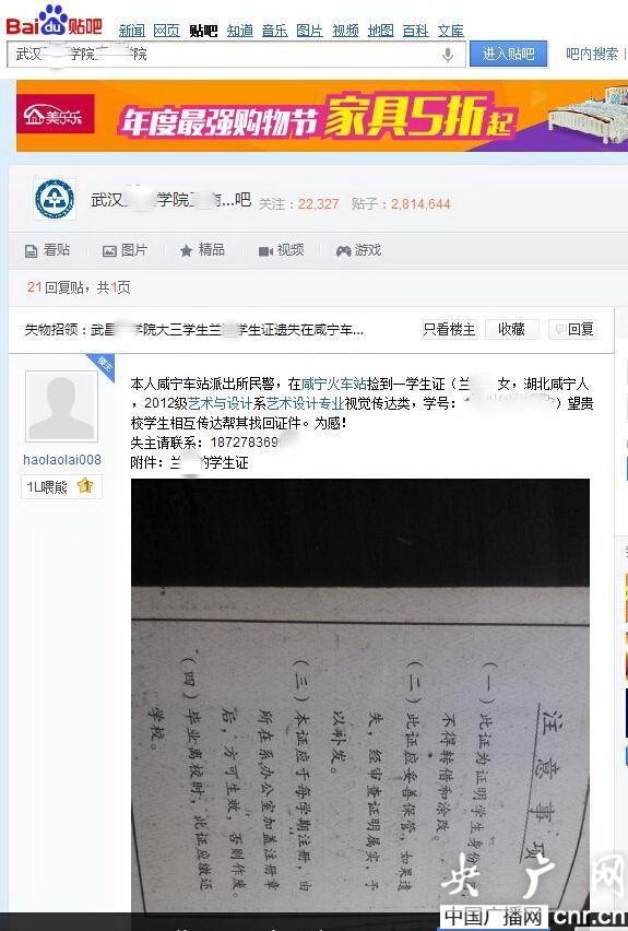 央廣網(wǎng)武漢11月5日消息(記者張毛清 通訊員馮暢)武昌某學(xué)院的大三學(xué)生小蘭最近在學(xué)校的貼吧里看到鐵路民警發(fā)布的失物招領(lǐng)帖子,驚喜地從鐵路民警處找回了遺失的學(xué)生證。鐵路民警通過網(wǎng)絡(luò)新媒體用心尋找失主的事情,一時(shí)間在該校貼吧上獲得贊譽(yù)一片。