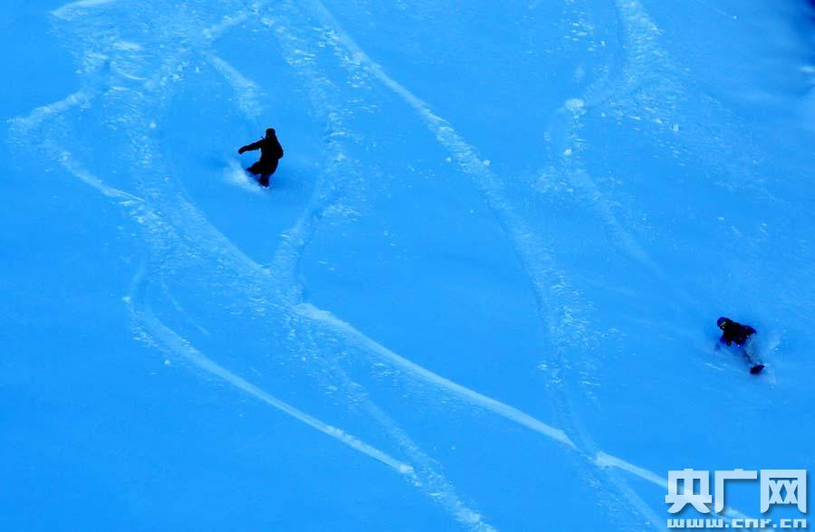單板愛好者滑出一道道雪痕(曲彥春攝)
