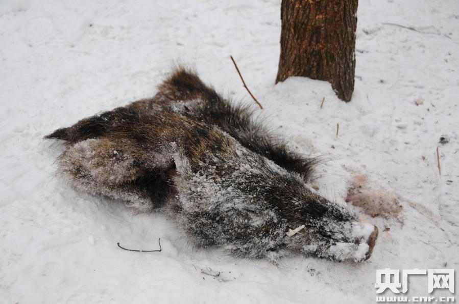 2015年12月14日至19日,白石山林業(yè)局組織了千余人次進(jìn)行的清山、清套行動,避免東北虎在林區(qū)受傷,保護(hù)東北虎的棲息地。在清山清套過程中,護(hù)林員意外發(fā)現(xiàn)了兩頭被東北虎捕食的野豬殘體。野豬殘體一大一小,相隔也就10多米遠(yuǎn)。大野豬都快被掏空了,就剩下一層皮,后腿大部分已經(jīng)消失不見,僅留下部分骨頭。小野豬被吃了一半。護(hù)林員還發(fā)現(xiàn),在勝利河林場出現(xiàn)疑似東北虎追趕一群狍子的腳印。