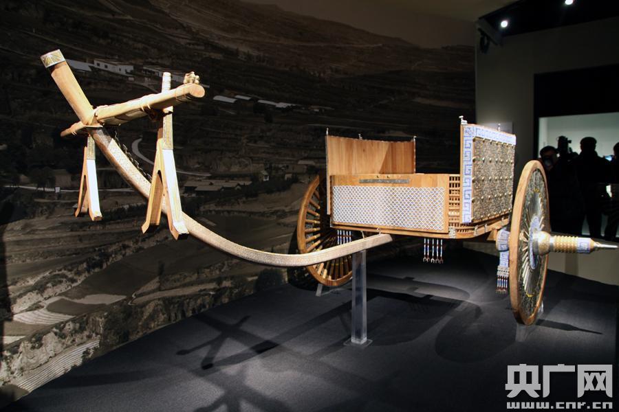 張家川回族自治縣馬家塬遺址出土的車輛復(fù)制品,參展人員稱,此為義渠王豪華座駕