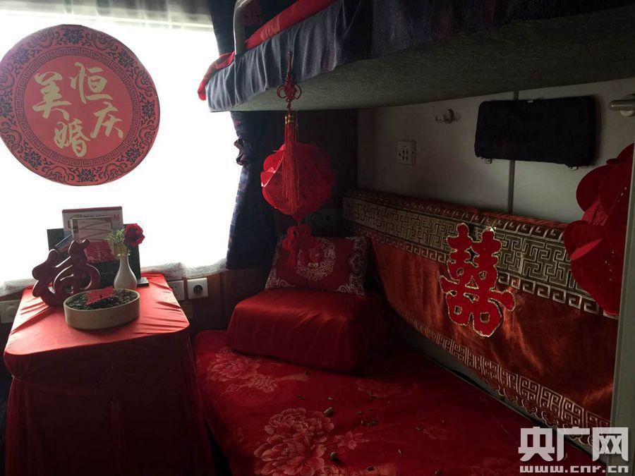 “我們?cè)谖⑿派峡匆娗岸稳兆舆@趟車上舉辦過(guò)婚禮,覺得這樣的婚禮挺個(gè)性、挺有紀(jì)念意義的,我們就商量在‘5·20’這個(gè)特別的日子里用特別的方式來(lái)記錄我們的青春!闭劶霸诹熊嚿吓e行婚禮,看著用列車包房裝扮得古色古香的婚房,新郎小張掀起了新娘的紅蓋頭。