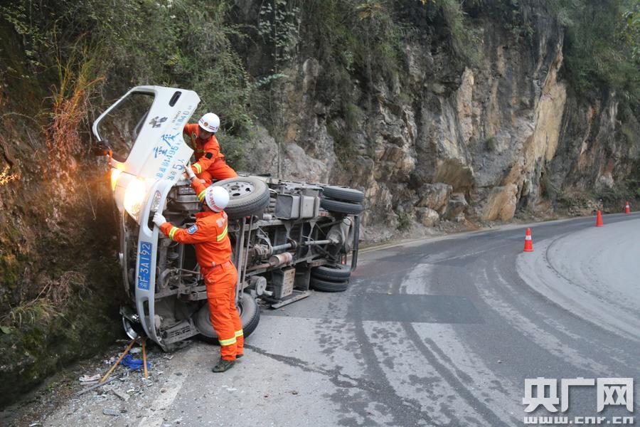 央廣網(wǎng)重慶11月1日消息(記者 劉湛 通訊員 宋林汶)今天清晨6時48分,重慶巫溪縣城廂鎮(zhèn)墨斗村省道201路段急彎處,一輛從巫溪縣上磺鎮(zhèn)開往巫溪縣城方向的輕型貨車失控發(fā)生側(cè)翻撞向路邊山坡,車上2人被困。巫溪縣消防大隊接到報警電話后,迅速出動一輛搶險救援車、6名消防官兵趕往現(xiàn)場救援,消防官兵到場后將車上2名被困人員成功救出,事故造成1人死亡、1人受傷。