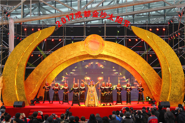 當(dāng)晚,在金沙遺址博物館遺跡館前的主舞臺上,一曲《太陽禮贊》拉開了2017成都金沙太陽節(jié)的帷幕,開啟為期21天的新春狂歡。本屆太陽節(jié)主舞臺外形設(shè)計采用古埃及荷魯斯之眼造型,寓意穿越時空的神圣和智慧,太陽神鳥圖案鑲嵌其中作為“點睛之筆”,將古埃及與古蜀金沙連接和匯聚。