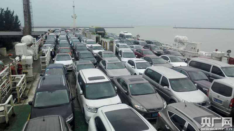 瓊州海峽火車輪渡甲板上滿載車輛