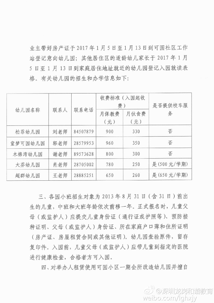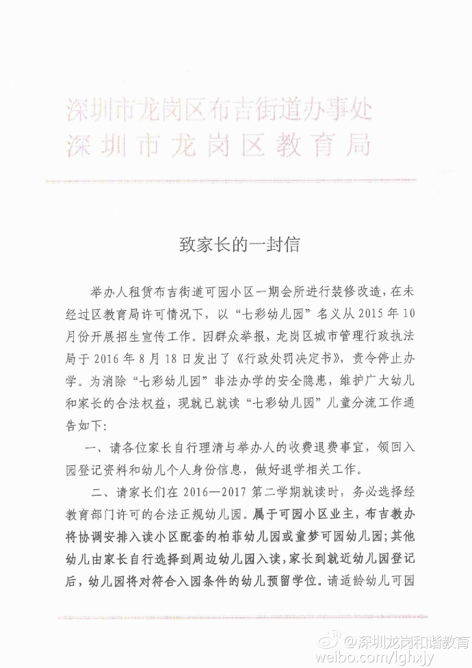 2017年1月10日,布吉街道辦、我局聯(lián)合發(fā)布《致家長(zhǎng)的一封信》,提醒家長(zhǎng)在2016—2017學(xué)年第二學(xué)期就讀時(shí),務(wù)必選擇經(jīng)教育部門許可的合法正規(guī)幼兒園,并到社區(qū)工作站進(jìn)行登記,以便做好學(xué)位預(yù)留。屬于可園小區(qū)的適齡幼兒,布吉教辦將協(xié)調(diào)安排入讀小區(qū)配套的柏菲幼兒園或童夢(mèng)可園幼兒園;其他適齡幼兒安排入讀就近的普惠性幼兒園。