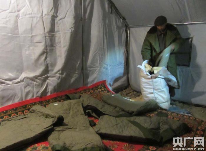 受災(zāi)群眾在帳篷里整理收到的棉衣