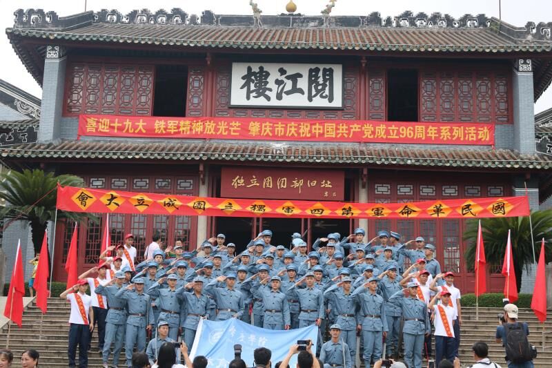 本次活動(dòng)中,100名少先隊(duì)員在現(xiàn)場(chǎng)合唱《沒(méi)有共產(chǎn)黨就沒(méi)有新中國(guó)》,用歌聲學(xué)習(xí)先烈的革命精神,牢記先輩們的艱苦奮斗;100名肇慶學(xué)院的學(xué)生扮演“葉挺獨(dú)立團(tuán)”戰(zhàn)士,在軍號(hào)聲中出場(chǎng),通過(guò)操練、隊(duì)列等方式在現(xiàn)場(chǎng)實(shí)景再現(xiàn)了出師北伐的故事;由肇慶市委組織部和市直工委組織的100名黨員,身穿紅色黨員志愿者服裝,在主持帶讀下,重溫入黨誓詞,籍此促使每個(gè)黨員堅(jiān)定理想信念,不忘初心、繼續(xù)前進(jìn)。