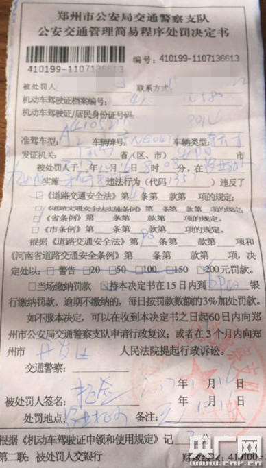 鄭州交警六大隊(duì)民警崔警官告訴記者,民警現(xiàn)場執(zhí)法開具罰單,必須在交通警察一欄中簽字或者蓋章,如果沒有民警簽章,說明他執(zhí)法程序不完全,不規(guī)范。