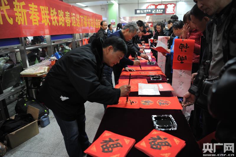 “紅桃賀歲杏迎春,丹鳳呈祥龍獻(xiàn)瑞”旅客分別拿著書(shū)法家寫(xiě)給自己的對(duì)聯(lián)拍照留念,送春聯(lián)活動(dòng)現(xiàn)場(chǎng)一派喜氣洋洋。來(lái)自江西的姚女士帶著一歲多的女兒拿著紅紅火火的“福”字,高興地對(duì)記者說(shuō):“沒(méi)想到在返鄉(xiāng)的途中,還有書(shū)法家親自送春聯(lián),我心里感到特別快樂(lè)和溫暖!眮(lái)自湖南衡陽(yáng)的男孩小陳說(shuō):“我一年都沒(méi)回老家看望父母了,給父母帶一副書(shū)法家寫(xiě)的對(duì)聯(lián),他們肯定喜歡!奔(xì)心的記者發(fā)現(xiàn)靦腆的小陳歡喜的明眸里竟有淚花在閃!按簼M乾坤福滿門(mén),天增歲月人增壽”書(shū)法家很快揮毫,把新年的祝福送給小陳遠(yuǎn)方的父母。從上午9點(diǎn)至16點(diǎn),書(shū)法家們共為旅客和鐵路職工書(shū)寫(xiě)、送出對(duì)聯(lián)500多幅,送出“!弊500多個(gè)。為2018年春運(yùn)旅客安全、平安、溫馨出行增添了喜慶溫暖的氣氛。