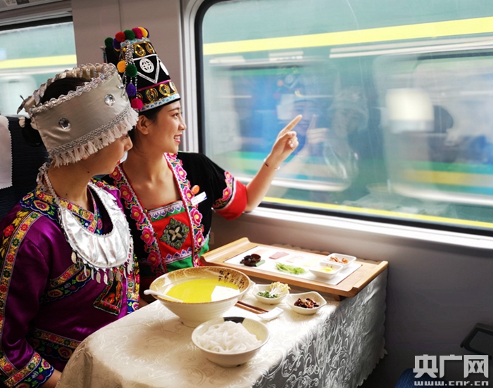 旅客體驗(yàn)昆明至蒙自時(shí)速160公里的CR200J型復(fù)興號動車組上(央廣網(wǎng)發(fā) 圖片由中國鐵路昆明局集團(tuán)公司提供)