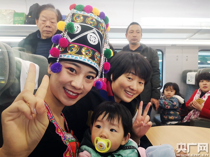 旅客在昆明至蒙自首次開行的時(shí)速160公里的CR200J型復(fù)興號動車上歡呼(央廣網(wǎng)發(fā) 圖片由中國鐵路昆明局集團(tuán)公司提供)