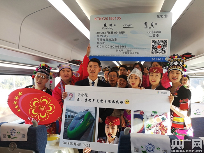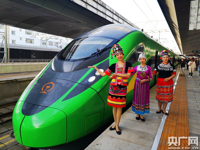 當(dāng)天,云南昆明、建水、蒙自等車站熱鬧非凡,當(dāng)?shù)厝罕娸d歌載舞,喜迎復(fù)興號的開行。