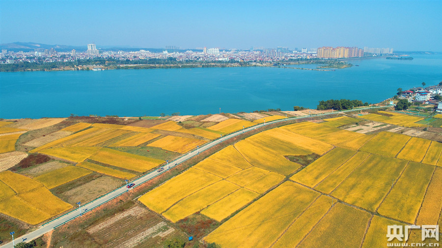 10月20日,在江西省吉安市泰和縣,空中俯瞰贛江,碧水藍(lán)天,稻田泛黃,金色岸線美如畫(huà),構(gòu)成一幅美不勝收的生態(tài)江景圖。