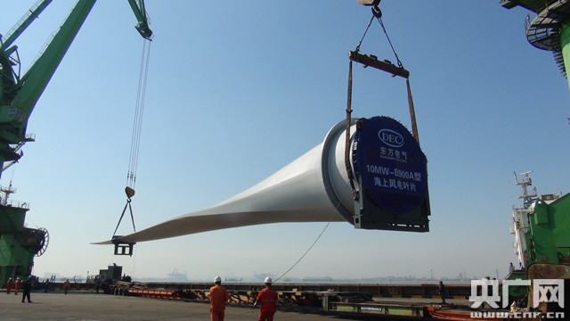 央廣網(wǎng)天津4月27日消息(記者陳慶濱 通訊員杜平喜)記者從天津港獲悉,4月26日,由我國(guó)自主研制的國(guó)內(nèi)首套10兆瓦海上風(fēng)電葉片,在天津港匯盛碼頭34段平穩(wěn)起吊裝船。三支90米長(zhǎng)的巨型葉片,如蛟龍出海,踏浪遠(yuǎn)征,搭載“博潤(rùn)”輪運(yùn)往福建水域的興化灣二期風(fēng)電場(chǎng)。