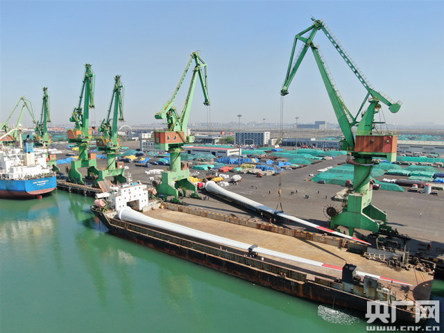 我國(guó)首套10兆瓦海上風(fēng)電葉片在天津港順利裝船(央廣網(wǎng)發(fā) 天津港供圖)