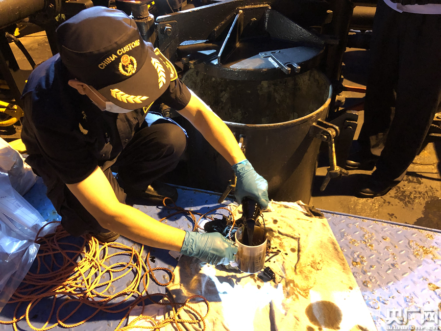 圖為深圳海關(guān)工業(yè)品檢測技術(shù)中心人員在深圳鹽田港碼頭在油污水卸載船上提取樣品 唐佳偉 攝