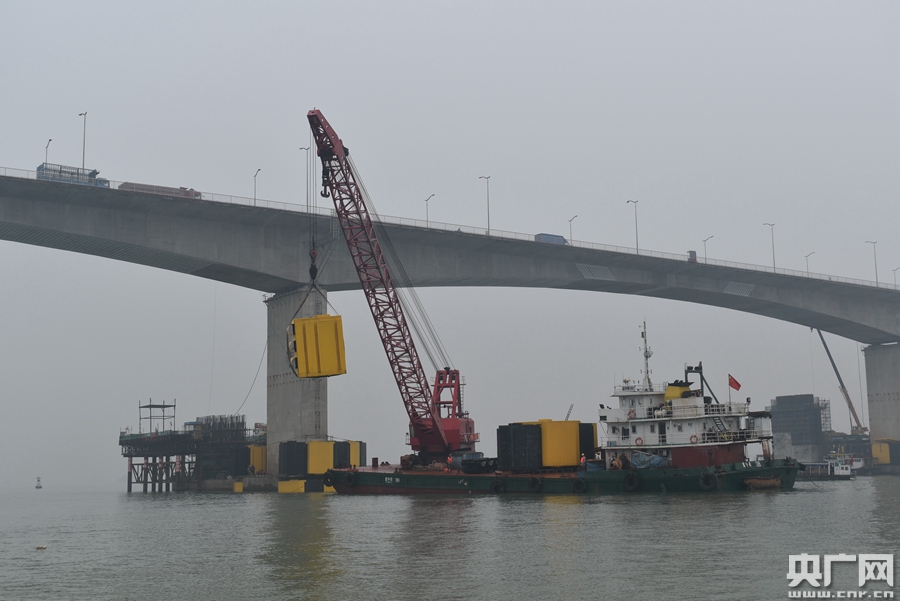 肇慶大橋防撞工程安裝浮箱作業(yè)現(xiàn)場(央廣網(wǎng)發(fā) 肇慶海事局供圖)