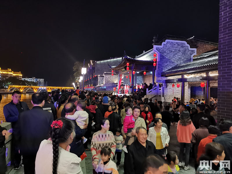 游客欣賞民俗文化街夜間河岸美景(央廣網(wǎng)發(fā) 通訊員供圖)