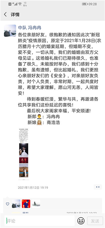 1月12日晚上,邯鄲磁縣消防救援大隊(duì)消防隊(duì)員馮冉冉在朋友圈宣布,他的婚禮將要推遲……