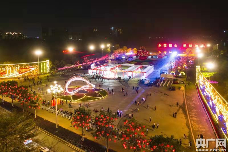 高達15米的大花籃是知識城分會場的亮點之一。待華燈初上,圍繞花籃萬盞燈籠點亮,呈現(xiàn)火樹銀花的勝景。