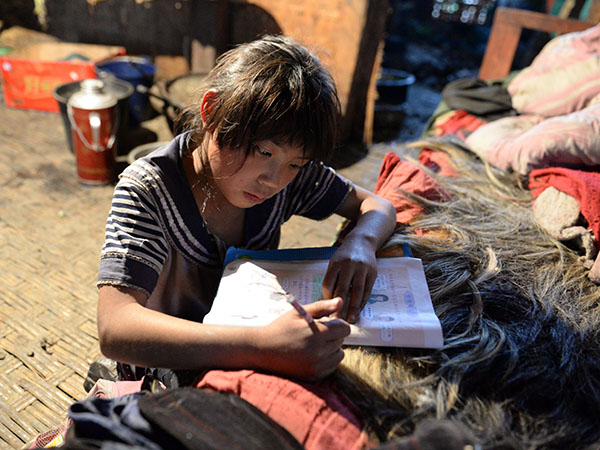 在云南省怒江州福貢縣木克基村,一名孩子趴在床上做作業(yè),她的家里沒有桌子(3月28日攝)。 新華社記者胡超攝
