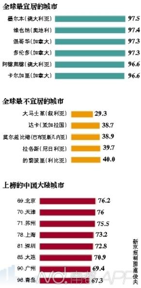 在此次被調(diào)查的140個(gè)城市中,澳大利亞的墨爾本成為全球最宜居城市。全球最宜居的五大城市幾乎被澳大利亞和加拿大瓜分。而處在戰(zhàn)亂之中的敘利亞首都大馬士革、利比亞首都的黎波里,以及基礎(chǔ)設(shè)施建設(shè)相對(duì)落后的孟加拉國(guó)首都達(dá)卡等城市則被評(píng)為最不宜居的城市。