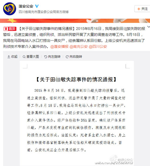 8月18日,失蹤女童田某敏的尸體在四川南充市蓬安縣馬回電站入水口被打撈上來(lái),尸體的腹部和右大腿根部有損傷,且腹部器官缺失。網(wǎng)上有傳言稱(chēng),田佳敏死前被人挖去了器官。對(duì)此,四川省南充市蓬安縣公安局官方微博“蓬安公安”于8月22日發(fā)表微博澄清案情經(jīng)過(guò),稱(chēng)“尸表未發(fā)現(xiàn)有生前的機(jī)械性損傷,腹部及右大腿根部的損傷為死后形成。法醫(yī)認(rèn)定:死者系生前入水溺亡,身上損傷和腹部器官脫落缺失系過(guò)往船只螺旋槳攪動(dòng)造成。”(記者孝金波 實(shí)習(xí)生方格格)