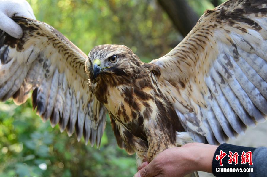 10月14日,河南鄭州,市民吳先生將一只灰褐色大鳥送到鄭州市林業(yè)局野生動物救護(hù)站。這只大鳥全身羽毛呈灰褐色,雙眼圓睜,尖嘴利爪,翅膀展開足有1.5米長。只要見人靠近,便展開翅膀,非常兇猛。專家鑒定該鳥為國家二級重點(diǎn)保護(hù)動物。 圖片來源:CFP視覺中國