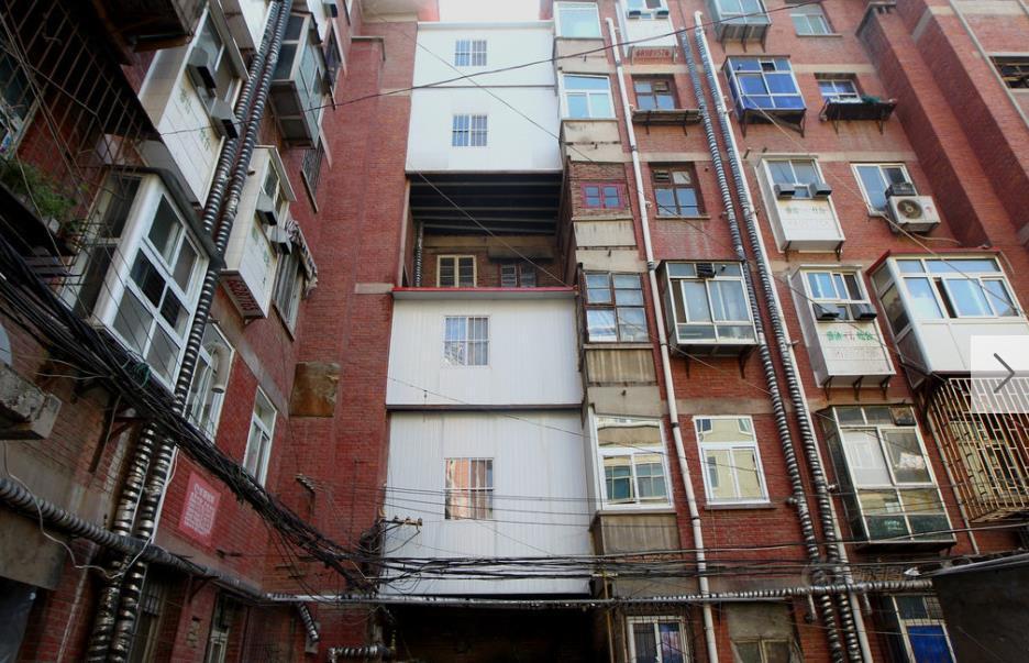 10月27日,河南省鄭州市崗杜街1號院內(nèi),一幢6層樓拐角處被人用鋼管和彩板在墻與墻之間搭建起了書層“懸空樓閣”。 圖片來源:東方IC