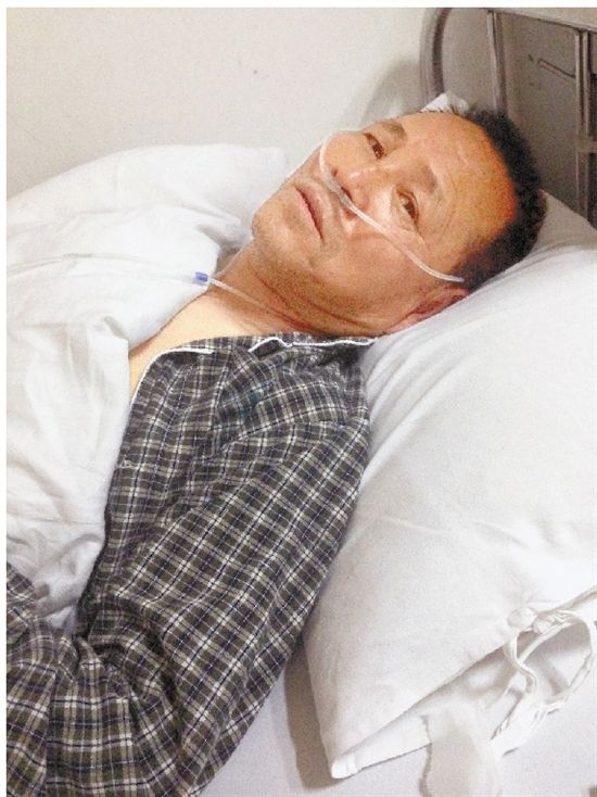 昨天下午,溫嶺第一人民醫(yī)院病床上,張忠法頭發(fā)花白皺紋滿面,鼻子上插著軟管,通過一個儀器艱難呼吸著。