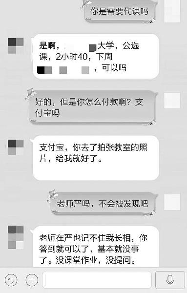 “代課具體就是幫人答到,一般不會(huì)要求記筆記的!彼f(shuō),如果有測(cè)驗(yàn)考試就會(huì)讓對(duì)方適當(dāng)加錢,“老師一般不會(huì)發(fā)現(xiàn),發(fā)現(xiàn)了我就盡量搪塞,假如真被老師發(fā)現(xiàn)我是假的也不是我的責(zé)任啊!