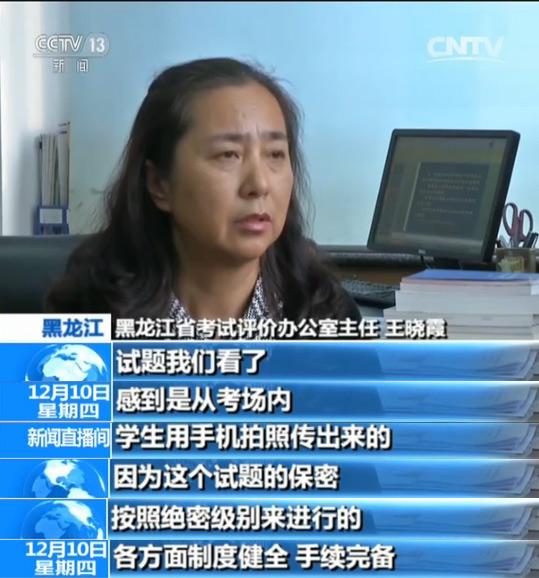黑龍江省考試評價辦公室主任王曉霞:試題傳出當(dāng)天,我們做了初步判斷,認(rèn)為是考場內(nèi)學(xué)生用手機(jī)拍照傳出來的。