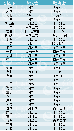 (資料來(lái)源于各省日?qǐng)?bào)及人大、政協(xié)網(wǎng)站,內(nèi)容截至1月4日,實(shí)際時(shí)間以當(dāng)?shù)貢?huì)議召開(kāi)時(shí)間為準(zhǔn)。制表 馬麗婭)