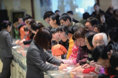 國際金價雖然一直上漲,但是北京菜百、國華等各大黃金賣場的報價都是按照節(jié)日期間已休市的上海黃金交易所價格確定,因此,節(jié)日期間黃金價格并沒有跟進上漲,再加上春節(jié)本身就是黃金消費旺季,京城金店客流增大。