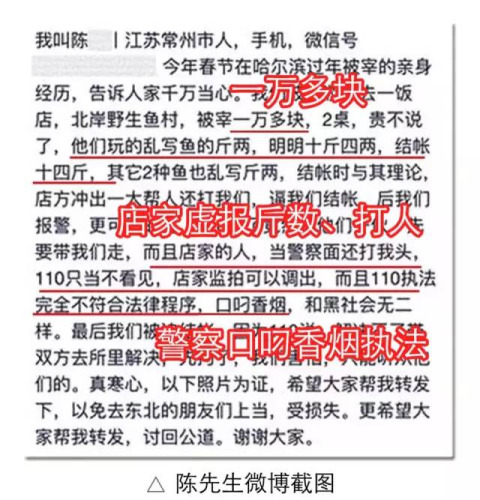 陳先生在微博上發(fā)文描述了自己春節(jié)在哈爾濱被宰的經(jīng)歷,“萬元鐵鍋燉”的遭遇讓大多數(shù)網(wǎng)友同情,并“一片倒”地譴責(zé)北岸野生漁村餐廳“坑人又跌份”。