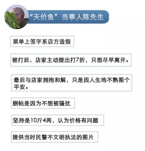 2月15日發(fā)布的調(diào)查結(jié)果只對價格做了說明,對所售鰉魚是否野生、導(dǎo)游和出租車司機引導(dǎo)消費是否存在利益輸送鏈條、酒店網(wǎng)上美譽度為何極低等問題并無解答。2月16日,當(dāng)事人陳先生接受央視采訪,對調(diào)查組的調(diào)查結(jié)果提出多點質(zhì)疑,希望還自己一個公道。