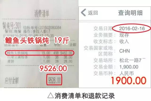 與陳先生有相同遭遇的上海趙先生向媒體反饋,2月8日曾與家人在涉事飯店消費19斤鰉魚頭,花費9526元,向當(dāng)?shù)?2358熱線投訴后,昨日收到涉事飯店1900元賠償款。