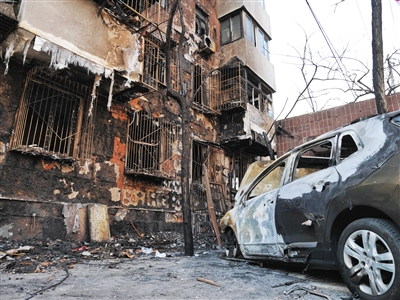 昨日,團(tuán)結(jié)湖北二條一號樓外墻被熏黑,樓下還有一輛被燒毀的轎車。新京報記者 王嘉寧 攝