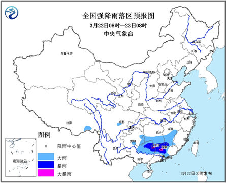 中國天氣網(wǎng)訊 中央氣象臺3月22日06時繼續(xù)發(fā)布暴雨藍色預(yù)警: