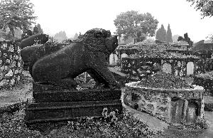 在廣西桂林市靖江王陵內,一尊神獸雕塑立在一片私墳之中。新華社發(fā)