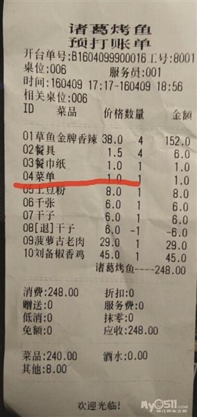 4月9日,鎮(zhèn)江市民馬先生帶著家人和朋友來到了鎮(zhèn)江城區(qū)大市口解放路新開業(yè)的一家諸葛烤魚店,吃完結(jié)賬時(shí),店家告知一共消費(fèi)了248元,于是服務(wù)員向馬先生提供了一張賬單。細(xì)心的馬先生發(fā)現(xiàn)在收費(fèi)單上,除了馬先生一家人消費(fèi)的菜品、餐具以及餐巾紙的價(jià)格以外,第四項(xiàng)赫然寫著菜單的價(jià)格收費(fèi)一元。馬先生告訴記者,因?yàn)樯碳也]有提前告知菜單需要收費(fèi),所以結(jié)賬時(shí)感到有點(diǎn)意外,而且之前也從來沒有遇到過這樣的情況。為此,馬先生向服務(wù)員提出了異議,對(duì)方表示菜單要收費(fèi)是老板定的,他們也沒有辦法?紤]到服務(wù)員是打工的,也不容易,之后也就沒多計(jì)較,菜單也并未帶走。因?yàn)橛屑胰撕团笥淹,為了不破壞氣氛,最終并未找老板詢問菜單要收費(fèi)的緣由。