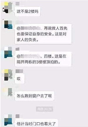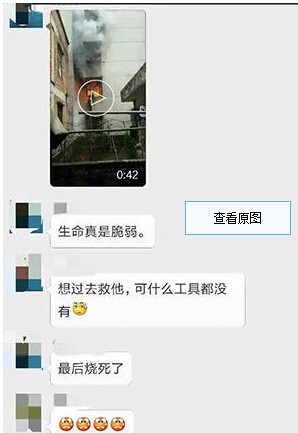 李先生(化名)描述,拍攝的時候他兩只腳都在抖,心里也很激動。在看到死者身上著火的時候他就沖下樓去,看看能不能幫上忙。樓下圍了好多人,一直都有砸門聲,他也幫不了。李先生(化名)表示,他沒有將視頻發(fā)到朋友圈,只是發(fā)到了一個同學(xué)群里。現(xiàn)在他的手機(jī)微信已經(jīng)被封號了,朋友給我截了當(dāng)時的圖。
