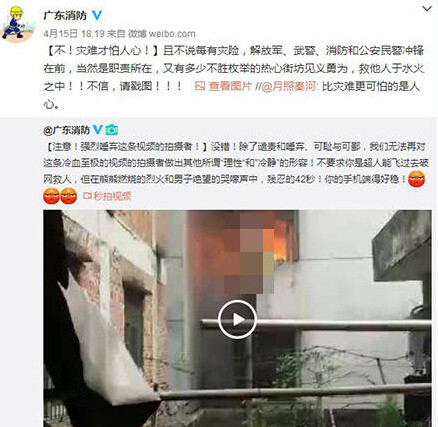 微信截圖顯示,在42秒視頻下方有三條李先生(化名)的訊息:“生命真是脆弱。想過去救他,可什么工具都沒有,最后燒死了!毕旅媸桥笥阉膫驚恐的表情包。發(fā)送時間在14日晚8點(diǎn)28分前。然而就是這個轉(zhuǎn)發(fā),把李先生推到了輿論的風(fēng)口浪尖,批評者、包括廣東消防微博認(rèn)為他殘酷冷血,不應(yīng)該這樣記錄拍攝他人的死亡。甚至警察也找上了門,查看了他的手機(jī)與視頻,要求他當(dāng)面刪除視頻,并錄下了口供。在民警離開后,他的微信就被封了號,到了第二天,網(wǎng)上出現(xiàn)了大量對他不利的言論。