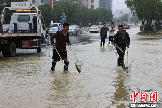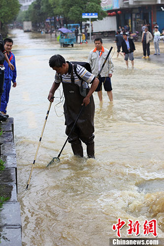 5月8日,湖南省永州市道縣再遭大暴雨襲擊,縣城多處低洼處被水淹,農(nóng)作物、水產(chǎn)養(yǎng)殖損失嚴(yán)重,不少民眾拿起漁具到被淹沒的馬路上捕魚。目前,道縣搶險、核災(zāi)和災(zāi)后自救工作已全面有序展開。