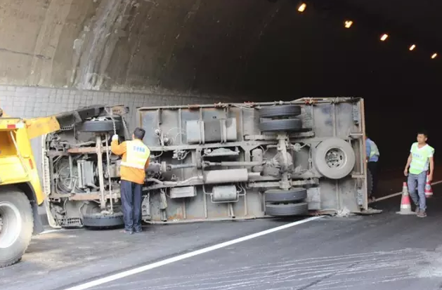 一輛大型貨車(chē)高速路隧道失去重心致翻車(chē)