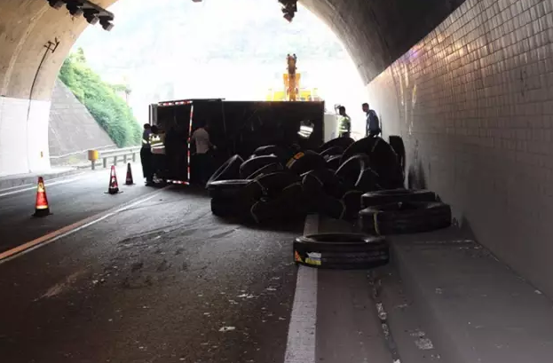 金華蘭溪籍駕駛員舒某說(shuō):他以六十多碼的速度在超車(chē)道內(nèi)行駛,當(dāng)行駛到黃塢壟隧道快要到隧道口時(shí),覺(jué)得這個(gè)速度在隧道里的超車(chē)道行駛不安全,于是想變回主車(chē)道,在向右變道時(shí),方向打得過(guò)大,撞上了隧道邊上的電纜溝,隨即車(chē)輛發(fā)生飄移,左右擺動(dòng),最后翻車(chē)。問(wèn)其翻車(chē)的原因,他說(shuō):超高了,重心提高后,車(chē)輛不穩(wěn)。裝載高度超出車(chē)頂三個(gè)輪胎,共一百六七十只輪胎。