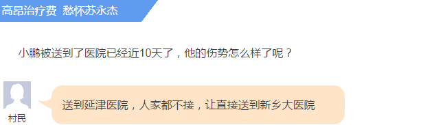 從村民的話中,不難聽出小鵬傷勢的嚴(yán)重性。在新鄉(xiāng)市第二人民醫(yī)院,小鵬已經(jīng)在重癥監(jiān)護(hù)室里躺了9天了。小鵬的爸爸蘇永杰說:光手術(shù)就花了5萬(含:傷情,醫(yī)療費(fèi))蘇永杰告訴記者,前段時間家里蓋房子借親戚朋友的錢還沒有還完,現(xiàn)在小鵬的醫(yī)療費(fèi)又花了10多萬,已經(jīng)把他壓的喘不過氣來。